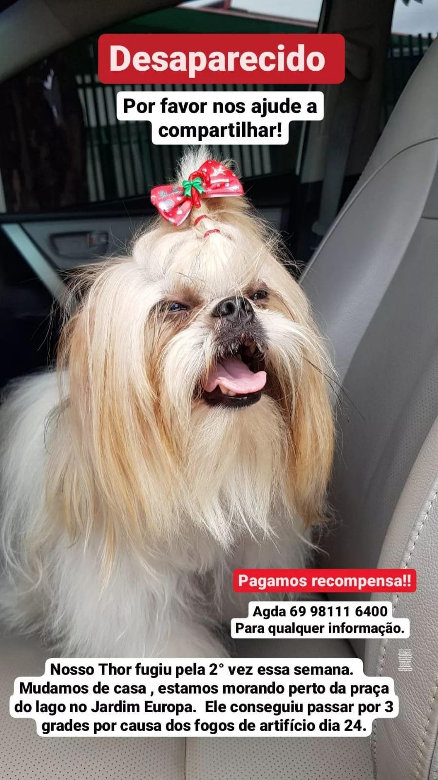 Está desaparecido desde o dia 24/12, esse cachorrinho macho da raça Shitzu, que atende pelo nome de Thor. O mascote fugiu da casa de seus donos, no Bairro Jardim Europa, próximo à praça do lago, é de cor branco com marrom claro e tem muito medo de fogos de artifício, motivo pelo qual teria ultrapassado 3 grades antes de alcançar a via pública. Thor é de uma criança, que está sentindo muito a falta do pet. Qualquer informação que leve ao paradeiro de Thor, favor entrar em contato com seus proprietários pelo telefone: 9 8111- 6400, falar com Agda. Paga-se recompensa para quem devolver o animalzinho à família.
