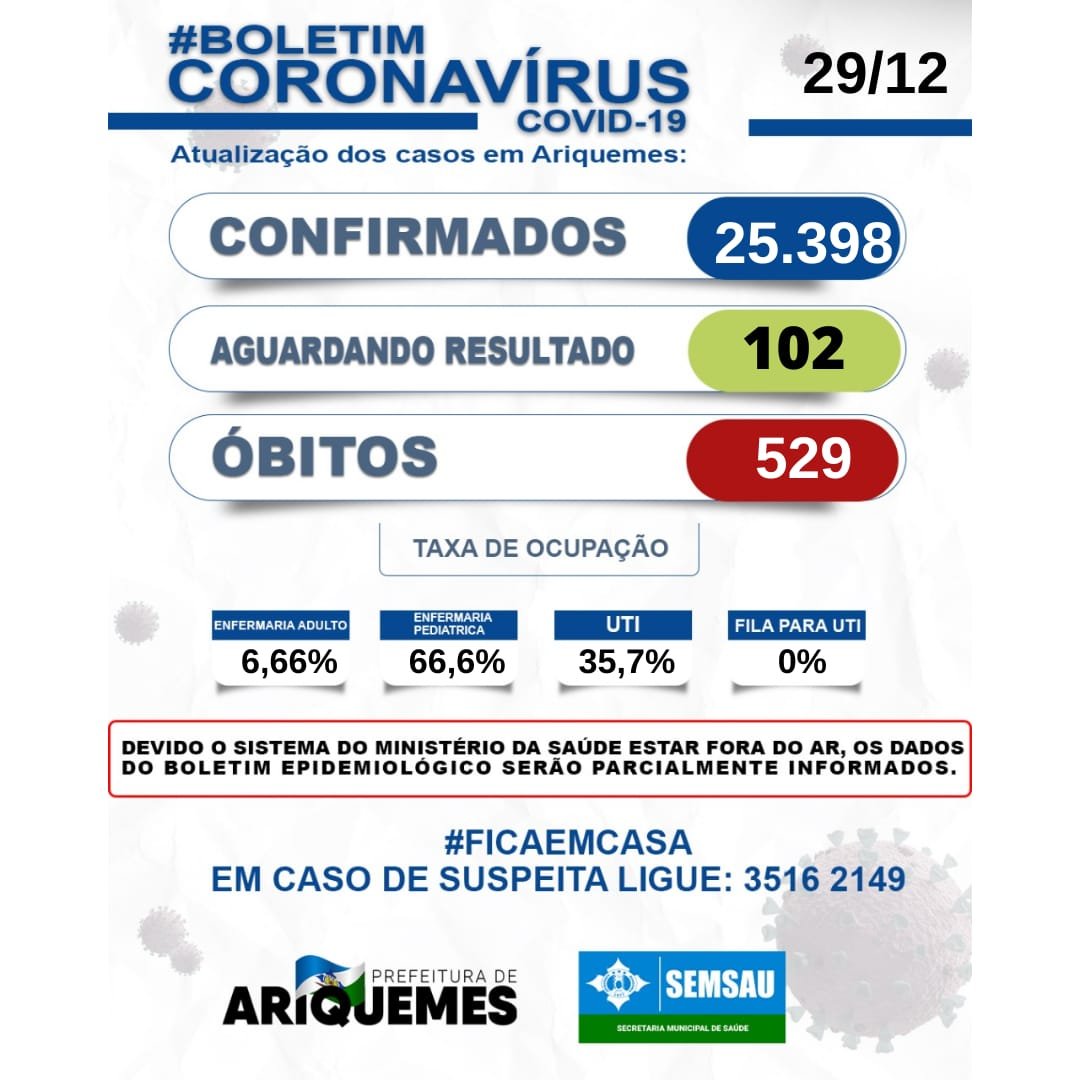 O sistema do Ministério da Saúde continua fora do ar, por este motivo, os dados do Boletim Epidemiológico serão parcialmente informados. Nesta quarta-feira (30), a cidade registra o total de 25.398 casos confirmados. 102 pacientes aguardam resultados de exames, em isolamento domiciliar. Até fechamento deste boletim, não houve registro de pacientes à espera por um leito de UTI em Ariquemes. Nenhum óbito foi registrado nesta quarta-feira. Acesse todas as informações sobre os gastos municipais, específicos no combate ao novo coronavírus, bem como, as despesas realizadas, plano de contingência, acompanhamento dos chamamentos públicos, relação de pessoas vacinadas e demais dados, acessando o site: http://coronavirus.ariquemes.ro.gov.br.