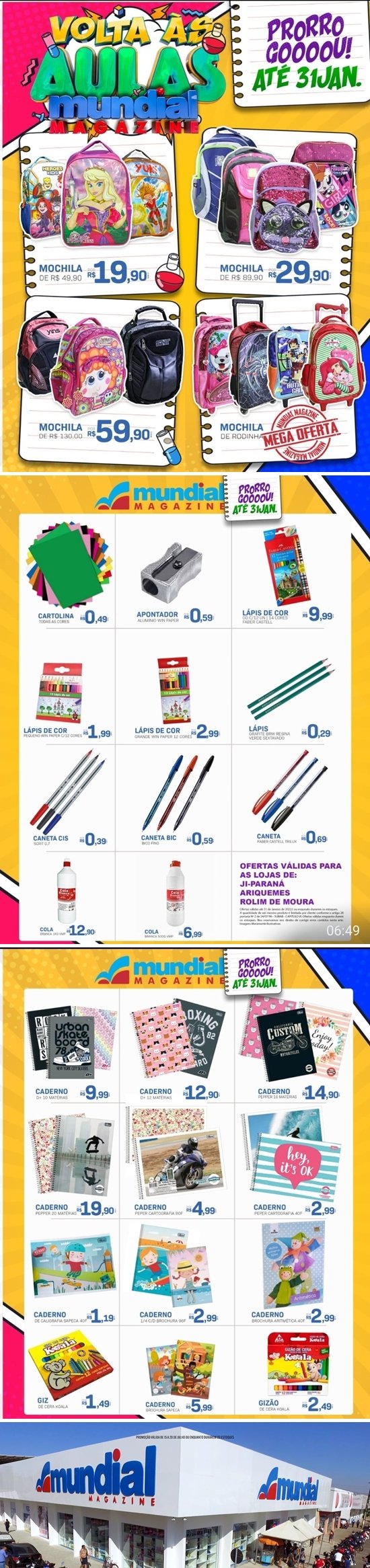 Janeiro é época de preparar a criançada para a volta às aulas, e a lista de materiais escolares tende a ser o vilão dessa hora! Mas não na Mundial Magazine, que preparou uma infinidade de produtos da sua lista de materiais escolares, que são uma verdadeira lição de economia. Então não perca tempo e venha para a Mundial Magazine, que está localizada na Avenida Jamari, n° 2820, em frente à Praça da Vitória. Tel. 9 9976-5712. Mundial Magazine, tudo o que há de melhor em um só lugar. Confira as promoções: