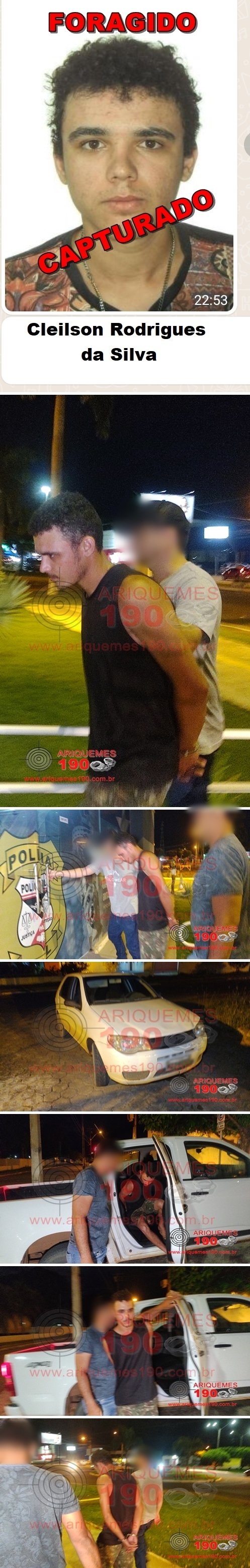 A equipe do Núcleo de Inteligência da Polícia Militar logrou êxito em capturar o Foragido da Justiça Cleisson Rodrigues da Silva, 23 anos. O fato ocorreu na noite desta quarta-feira, 16/03, na área rural do distrito de Joelândia, às margens do Rio Canaã, onde Cleisson estava escondido em uma barraca à beira do rio, juntamente com Renata de Oliveira Mendes e Adauto Gualberto Caetano, os quais fugiram no momento da abordagem e também estão foragidos. Cleisson, assim como Renata e Adauto são acusados de executar o idoso Paulo da Silva Alves, o qual encontra-se desaparecido. Investigações da Delegacia de Homicídios em Ariquemes apontam que a vítima teria sido eviscerada, esquartejada e seus restos jogados em um rio. Uma criança teria presenciado o crime e ajudado a Polícia com informações fundamentais para a elucidação do crime. Qualquer informação sobre o paradeiro de RENATA, ADAUTO, bem como informações que possibilitem a localização do corpo e a identificação do outro indivíduo que participou da execução podem ser repassadas através dos telefones 197 ou (69)3535-3510.