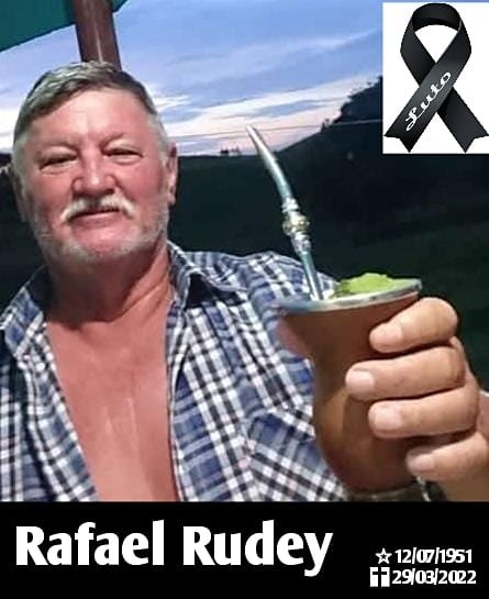 Familiares informam com pesar o falecimento do pioneiro Rafael Rudey, 70 anos, vítima de infarto, em sua propriedade, em Cacaulândia. Agradecemos a todas pelas mensagens de conforto recebidas até agora. Elas só mostram o quanto era querido por todos, e deixara muita saudade.