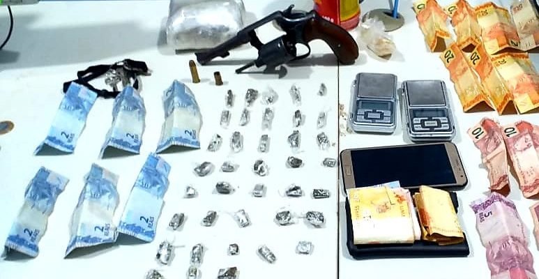 Um policial avistou a dupla se desfazendo de algo por cima do muro da residência, em uma intervenção rápida, conseguiram apreender o revólver calibre 38, um tablete de maconha e quase 40 invólucros da mesma substância.