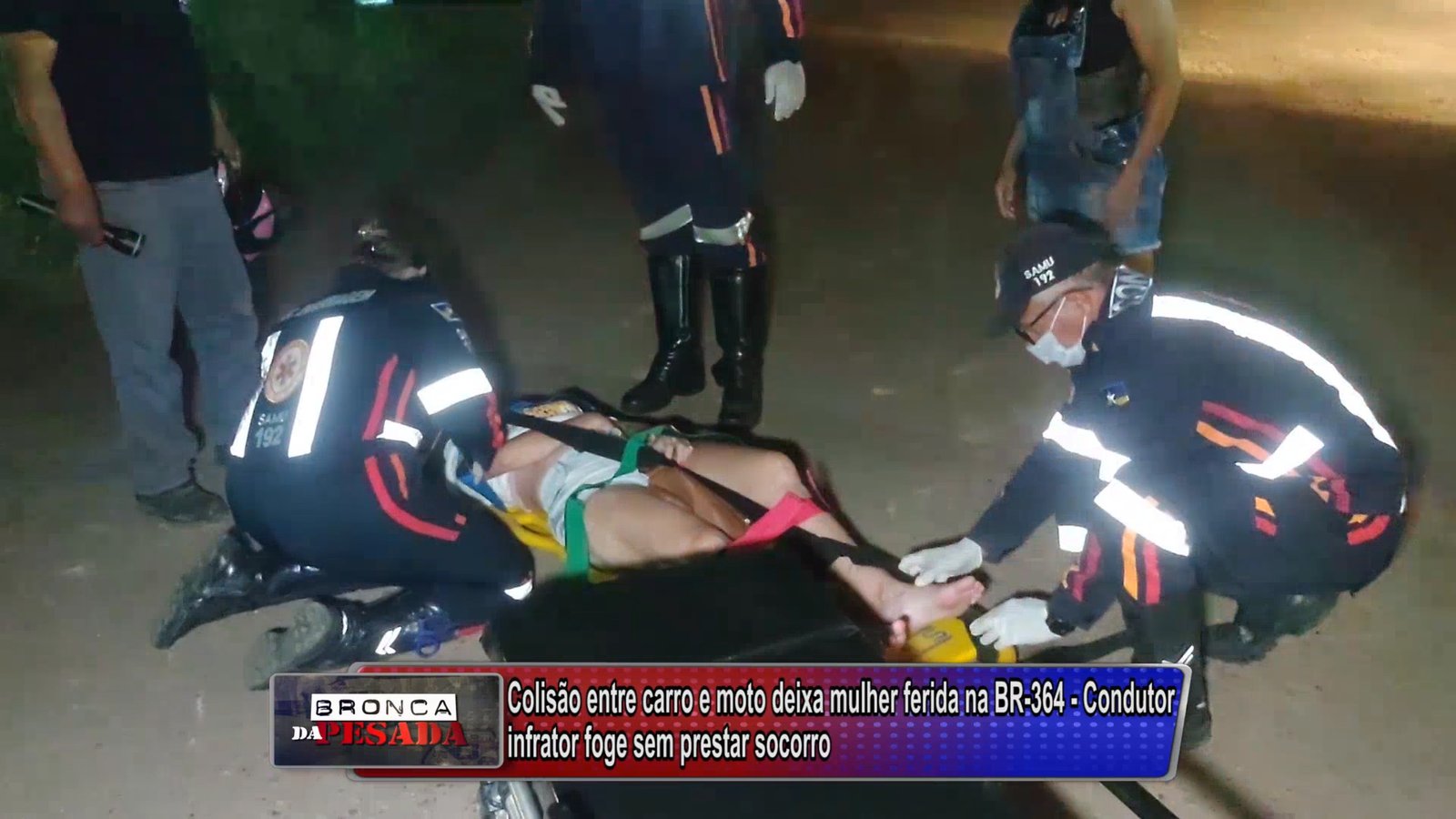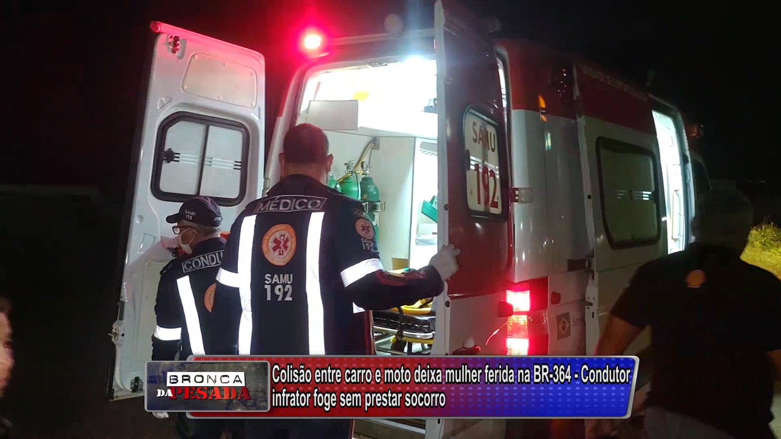 Uma colisão entre uma motocicleta e um carro na Br-364, no trevo com a Avenida Jaru em Ariquemes, deixou uma mulher ferida. O Serviço de Atendimento Móvel de Urgência (SAMU) foi acionado e socorreu a vítima até o Hospital Municipal de Ariquemes (HMA). Informações que a mulher estava em uma motocicleta quando houve a colisão com um veículo. O condutor infrator fugiu do local sem prestar socorro à vítima. Confira a reportagem que foi ao ar pelo Canal 35.1.