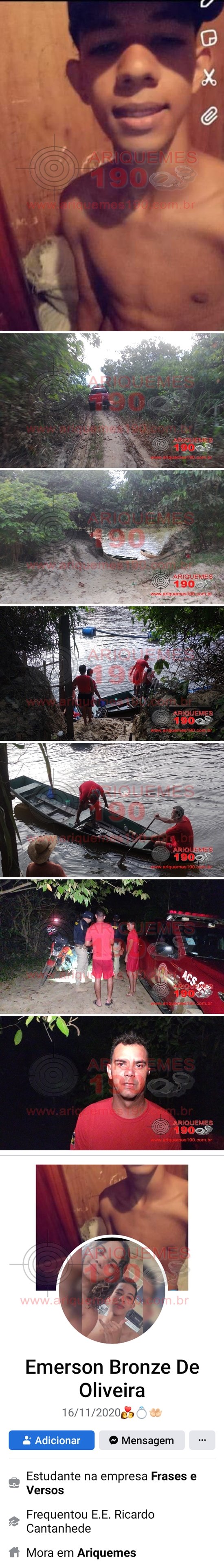 O jovem Emerson Bronze de Oliveira, 20 anos, desapareceu nas águas da Praia do Mutirão no Rio Jamari em Ariquemes neste domingo, 10/04. Emerson estava em um barco com a mãe, pai e a namorada, quando por motivos desconhecido a embarcação virou. O rapaz conseguiu ajudar a mãe e o pai a chegarem às margens do rio e ao retornar para ajudar a namorada, desapareceu nas águas. A namorada da vítima conseguiu chegar às margens e passa bem. As buscas continuam e uma equipe de mergulhadores do Corpo de Bombeiros de Porto Velho devem chegar para auxiliar nos trabalhos. Os Bombeiros trabalharam neste domingo até o anoitecer, reiniciando as busca logo cedo nesta segunda-feira, 11/04. Até o momento o corpo do jovem não foi localizado.