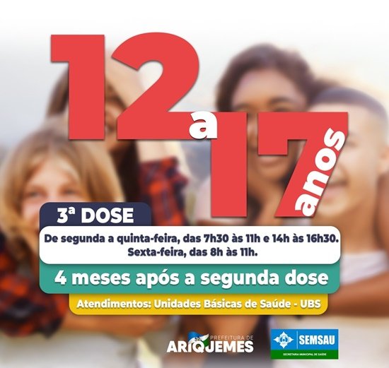 A Prefeitura de Ariquemes, através da Secretaria Municipal de Saúde Semsau, inicia nesta segunda-feira, 30, a aplicação da 3ª dose ou dose de reforço da vacina contra Covid-19, em adolescentes de 12 a 17 anos.