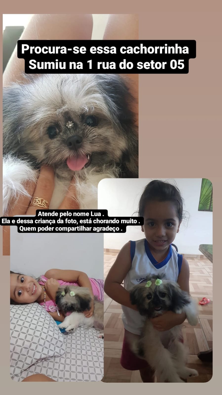 Essa cachorrinha, aparentemente da raça Shih-tzu, de cores branco, preto e marrom, está desaparecida. Ela atende pelo nome de Lua e fugiu nesta sexta-feira, 03/06, da residência de seus donos, localizada na 1° Rua do Setor 05. Lua pertence a uma criança, que está muito triste com o desaparecimento de sua mascote. Quem souber de informações que levem ao paradeiro de Lua, favor entrar em contato pelo telefone: 9 8124-4389.