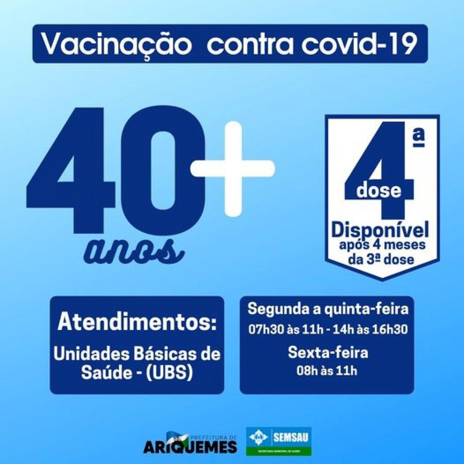 A Secretaria Municipal de Saúde - Semsau, inicia nesta terça-feira, 21, a aplicação da quarta dose da vacina contra Covid-19, para pessoas com 40 anos ou mais, que tenham recebido a terceira dose, com intervalo de quatro (4) meses. Os atendimentos ocorrerão nas Unidades Básicas de Saúde (UBS) dos bairros, 02, 05, 06, 09, 10, Jardim Alvorada, 25 de Dezembro, Mutirão e Jardim Zona Sul, de segunda a sexta-feira. Na UBS do bairro Mutirão, a imunização ocorrerá às segundas, quartas e sextas-feiras. Já na UBS do bairro Marechal Rondon, a ação acontecerá as terças e quintas-feiras. Horários: de segunda a quinta-feira, das 7h30 às 11h e 14h às 16h30. Sexta-feira, das 8h às 11h.