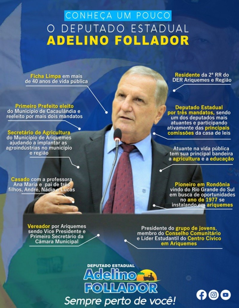 Dono de um currículo de destaque na política rondoniense, numa luta incansável em defesa da cidadania, dos mais pobres, da agricultura e pecuária, da educação, da saúde e de um contínuo e arrojado esforço pelo desenvolvimento do Estado de Rondônia, o deputado Adelino Follador (União Brasil) será candidato à reeleição de deputado estadual, pois sabe que muito mais poderá realizar pelo povo rondoniense.