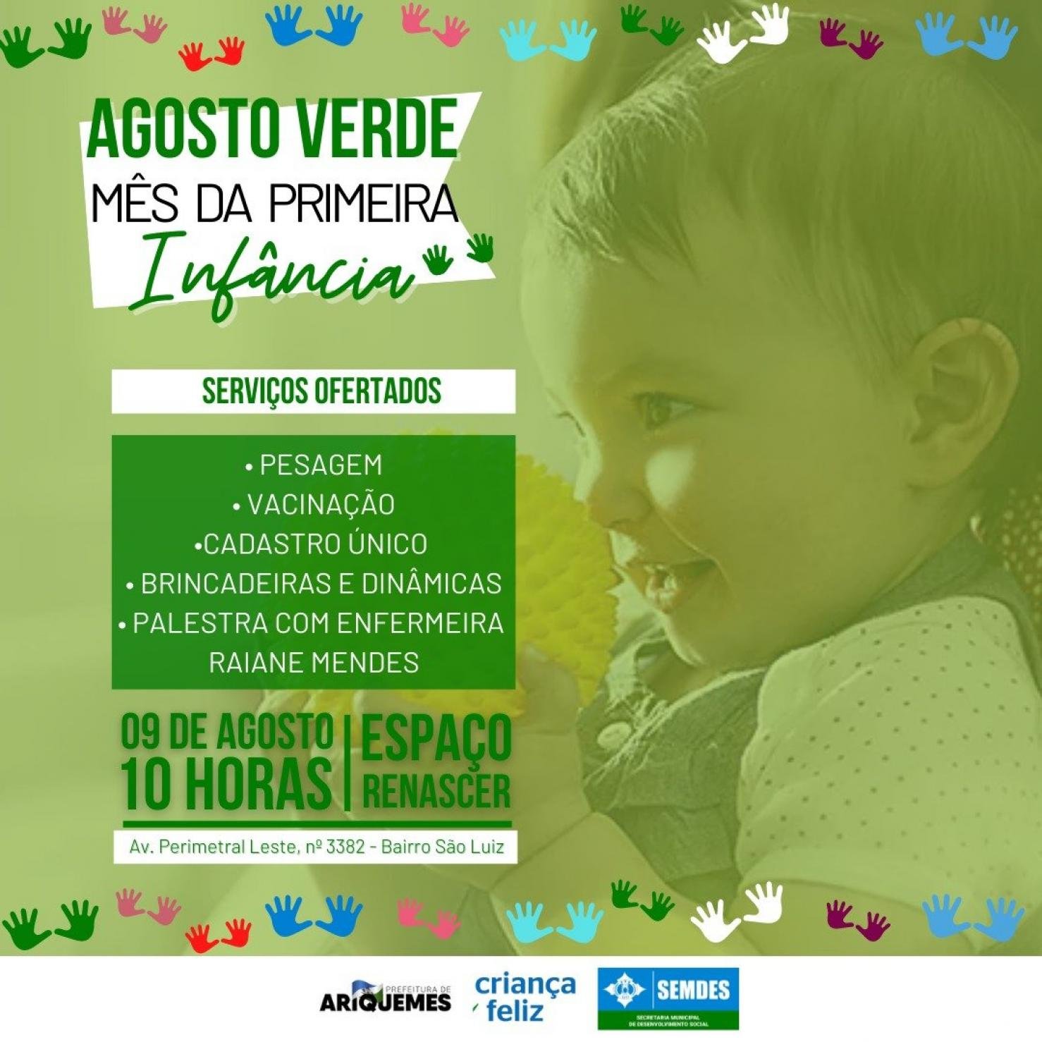 A Prefeitura de Ariquemes, através da Secretaria Municipal de Desenvolvimento Social - Semdes, realizará nesta terça-feira, 09, às 10 horas, na sede da Semdes, que fica localizada na Avenida Perimetral Leste, bairro São Luiz, antiga sede da Renascer, uma ação alusiva ao mês da primeira infância, campanha “Agosto Verde”.