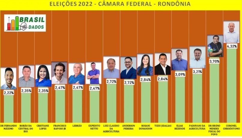 A dez dias das eleições estaduais em Rondônia, o Instituto Brasil Dados divulgou mais uma pesquisa de intenção de votos, para deputado federal. O sobe e desce de candidatos nesta reta final de campanha é normal e muitos candidatos vão aproveitar para fazer suas ultimas investidas sobre os eleitores que estão indecisos, que somam mais de 35%. Segundo a pesquisa, o deputado federal Coronel Chrisóstomo (PL) continua na liderança das intenções de voto com 4,32%, seguido do advogado Breno Mendes (Avante) com 3,70% e do ex-secretário Padovani da Agricultura (3,21%). O ex-diretor do DER-RO, Elias Rezende vem em seguida com 3,09% e Rosani Donadon, empatada com Tiziu Jidalias com 2,84%.