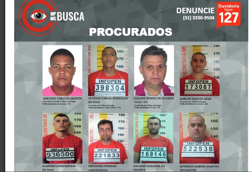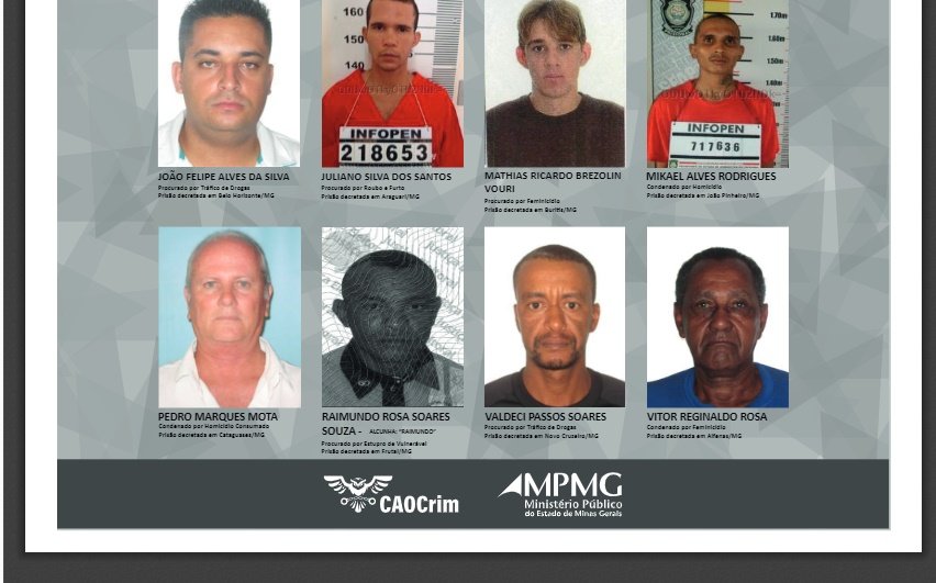 O Centro de Apoio Operacional das Promotorias Criminais, de Execução Penal, do Tribunal do Júri e da Auditoria Militar (CAOCRIM), do Ministério Público de Minas Gerais, encaminhou ao Ministério Público de Rondônia um cartaz com fotos de pessoas procuradas pela justiça mineira. O MPMG pediu a divulgação das imagens, pois os foragidos podem estar em qualquer lugar do Brasil, inclusive em Rondônia.