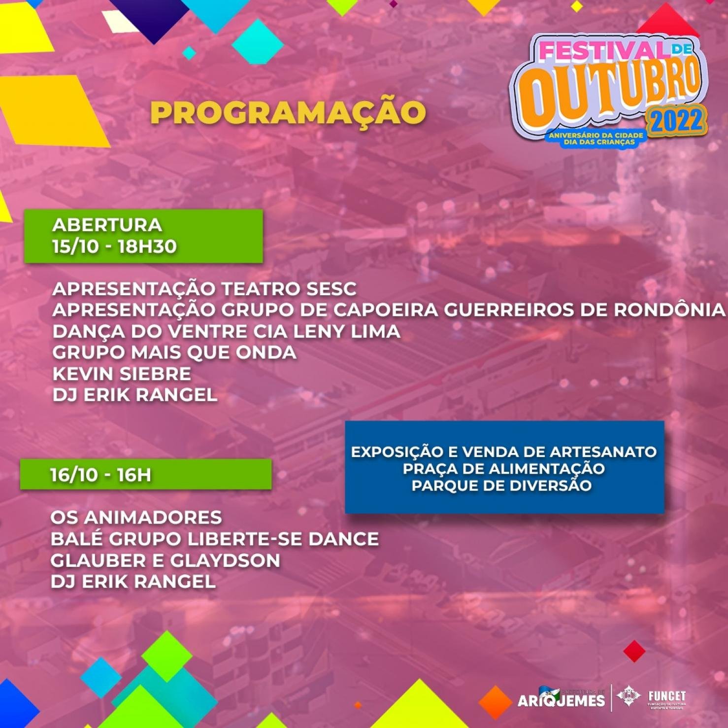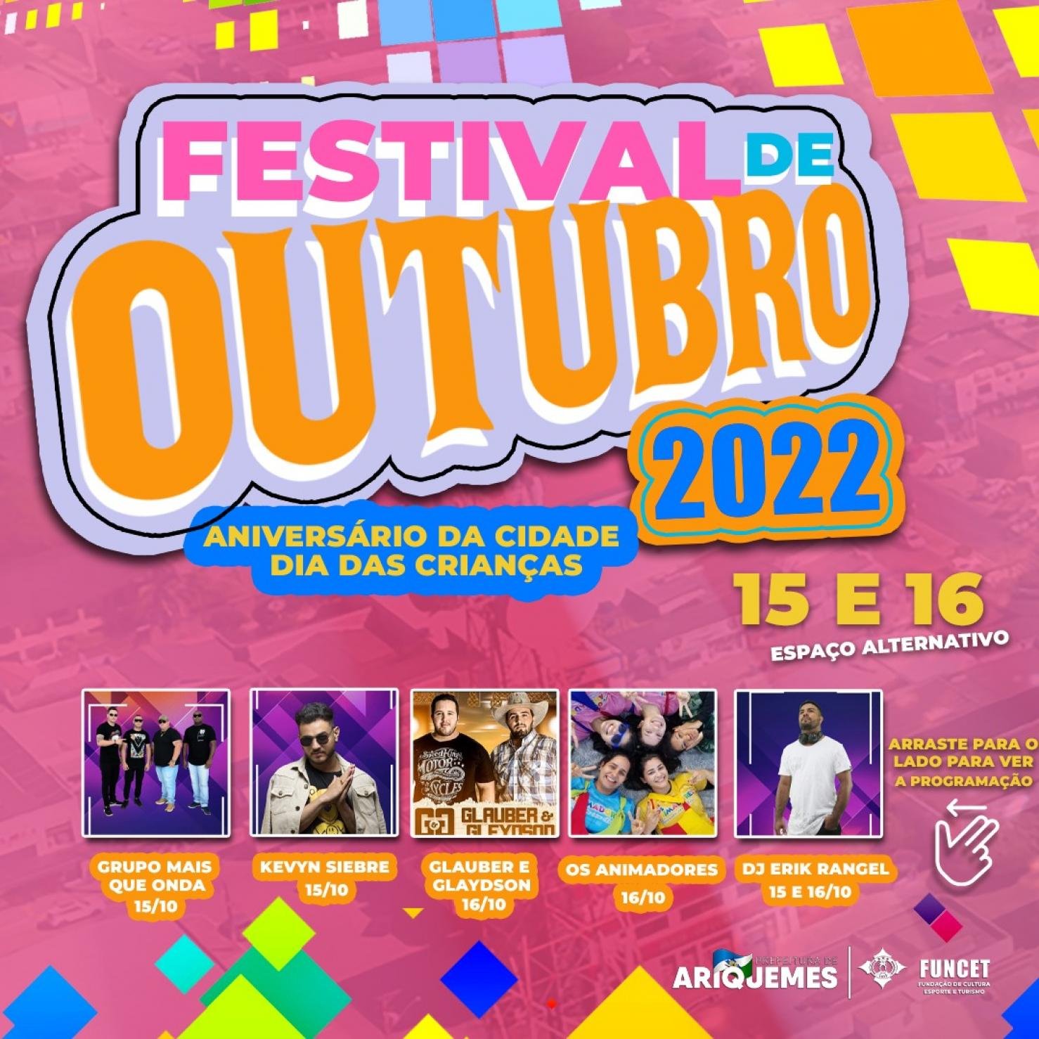 Para comemorar o aniversário da cidade e o dia das crianças, a Prefeitura de Ariquemes, através da Fundação de Cultura, Esporte e Turismo - Funcet, realizará o Festival de Outubro.