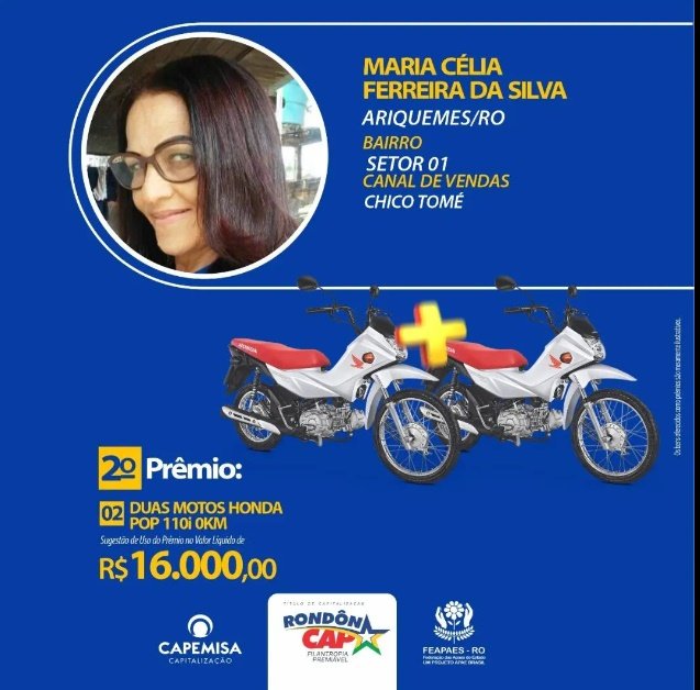 Com o RondonCap várias famílias de Rondônia já realizaram seus sonhos. E no último domingo, 09/09, a sorte saiu para Ariquemes, mais uma vez! No 2° Prêmio, R$ 16.000,00 mil (São duas motos) foi para a moradora de Ariquemes Maria Célia Ferreira da Silva. Confira a reportagem que foi ao ar pelo Canal 35.1 com a ganhadora. Faça como o Maria, acredite na sorte e compartilhe amor, ajude as APAEs de Rondônia e deixe a sorte ajudar você.