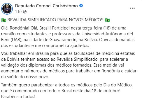 Confira a postagem feita pelo Deputado Federal Coronel Chrisóstomo, após um reunião na Universidad Autónoma del Beni (UAB).