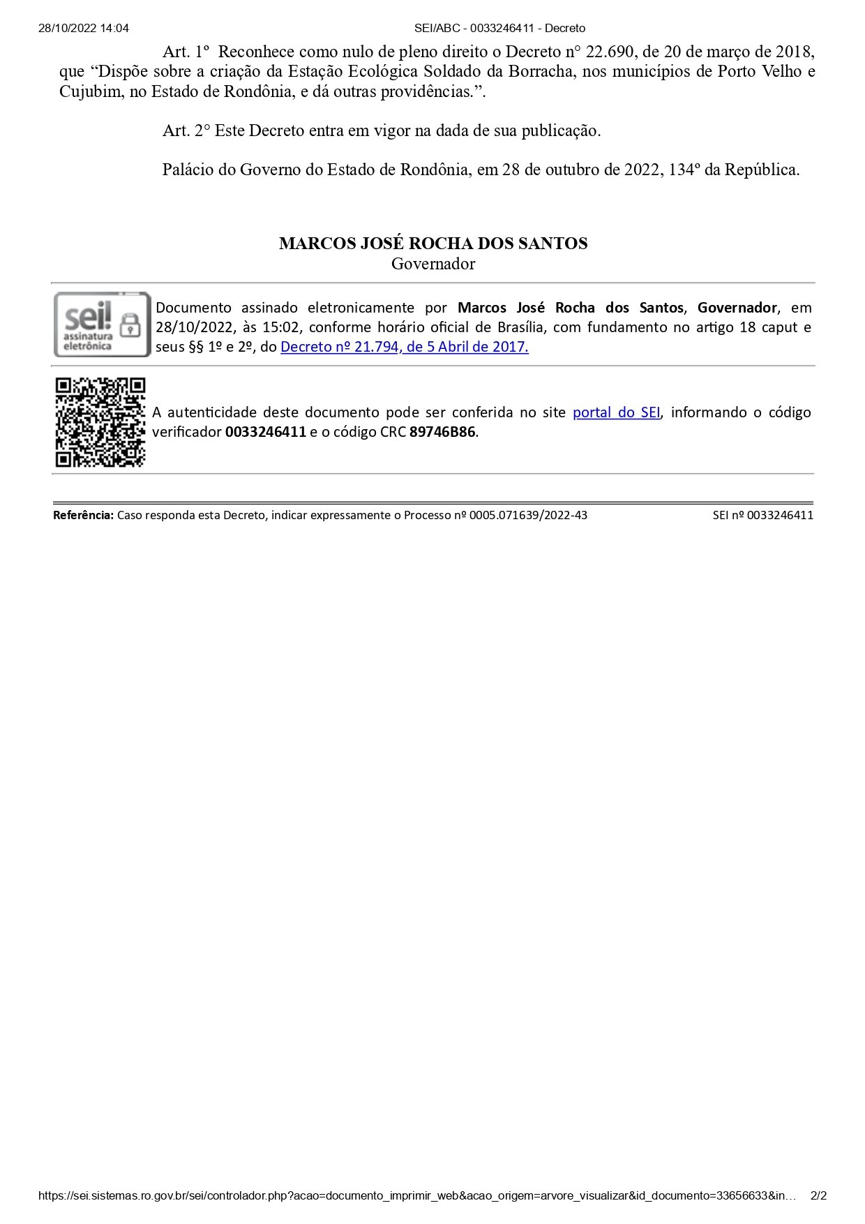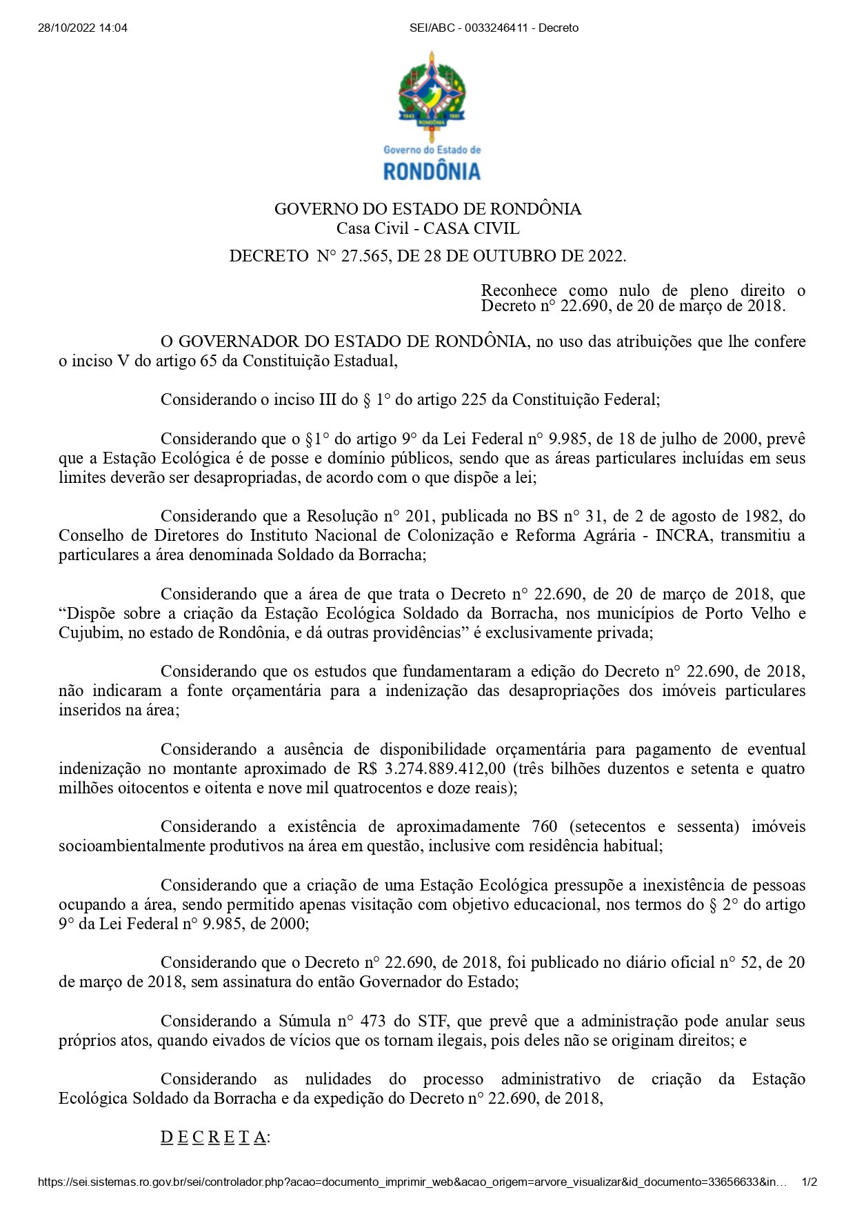 O Governador Coronel Marcos Rocha revogou no dia 28 de outubro de 2022 o decreto que estabelecia a criação da “Estação Ecológica Solado da Borracha”, a qual foi criada em 2018 pelo então governador Confúcio Moura junto com outras dez reservas ambientais.