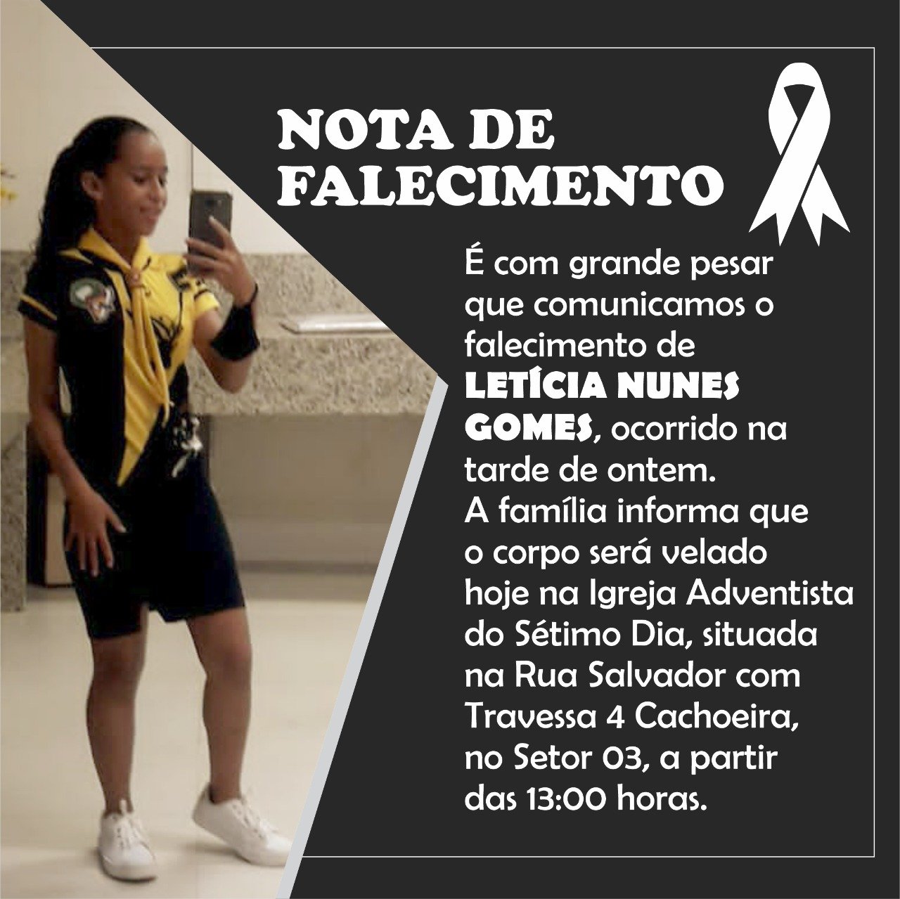 É com grande pesar que a família de Letícia Nunes Gomes, 13 anos, comunica seu falecimento ocorrido na tarde dessa quinta-feira, 10/11. O Corpo de Letícia será velado nesta sexta-feira, 11/11, na Igreja Adventista do Sétimo Dia, situada na Rua Salvador com Trav. 4 Cachoeiras, Setor 03 em Ariquemes, a partir das 13 horas. Que nesse momento de dor, o Deus Criador possa confortar familiares e amigos.