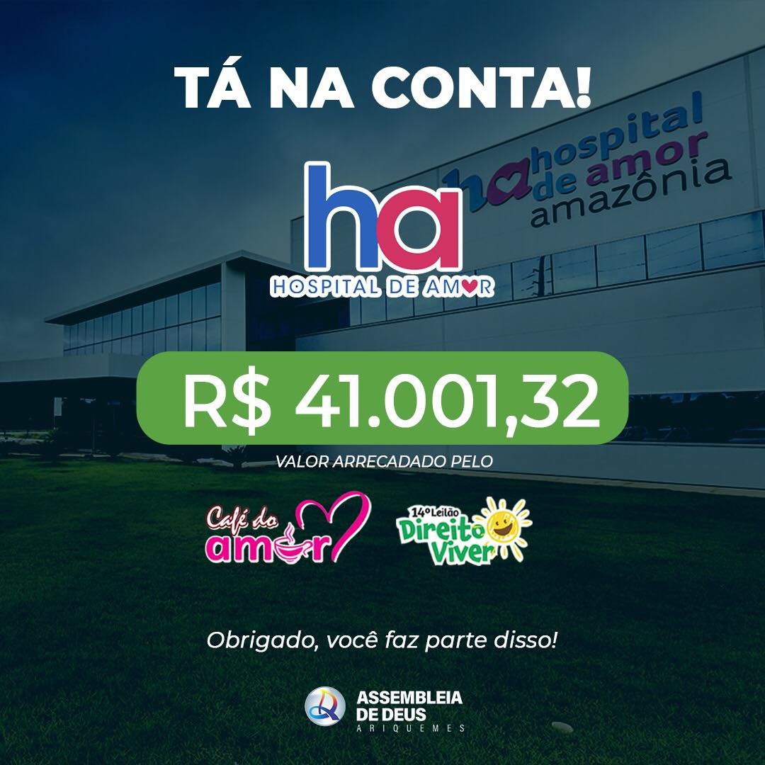 A Igreja Evangélica Assembleia de DEUS de Ariquemes (IEAD), realizou pela primeira vez o Café do AMOR, isso mostra que a corrente de Amor, só tem aumentado em Ariquemes em prol ao Hospital de Amor da Amazônia. O Pastor Presidente da IEAD, Dr. André, ao conceder entrevista ao Canal 35.1 agradeceu a todos os membros pela dedicação e empenho, que resultou no sucesso do Café do Amor realizado pela primeira vez pela IEAD. “Cuidar de quem precisa. O amor se multiplica quando semeamos no próximo”, afirmou. O Pres. da Comissão o 14° Leilão Direito de Viver agradeceu ao Pastor André e aos membros IEAD, pela organização e dedicação que resultou no sucesso desta corrente de Amor. Confira a reportagem que foi ao ar no Canal 35.1.
