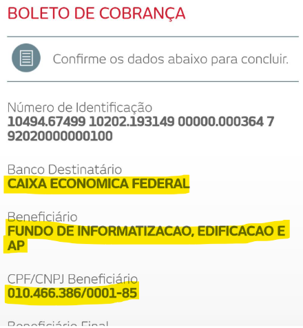 f) nomes que constem no boleto bancário pode não ser o que estarão descritos nos códigos descritos no boleto, então é SEMPRE bom conferir tudo;
