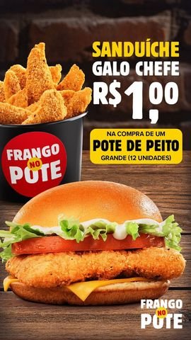 É isso mesmo! Só no Frango no Pote você compra o sanduiche Galo Chefe por apenas R$ 1,00, na compra de 01 pote de Peito grande (12 unidades). Não perca essa oportunidade de saborear o melhor frango da cidade a um preço incrível, mas corra que essa promoção é por tempo limitado. O Frango no Pote está localizado na Av. Canaã, 3191 - Setor 03 em Ariquemes. Telefone: 2103-4401.