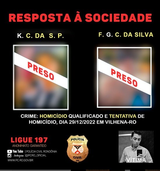 A Polícia Civil do Estado de Rondônia, por intermédio da Delegacia Especializada em Crimes Contra a Vida -DECCV, cumpriu na manhã desta quarta-feira(04/01), o mandado de prisão contra os dois suspeitos de matarem Carlos Garcia dos Santos Junior (Juninho Laçador) e da tentativa de homicídio contra Carlos Marinho Ramos de Oliveira, ocorrido na noite de quinta-feira(29/12/2022), em Vilhena-RO.