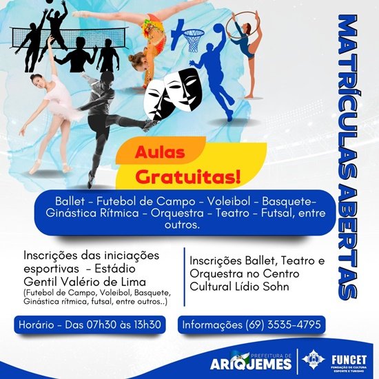 A Fundação de Cultura, Esporte e Turismo - FUNCET, abre inscrições para matrículas para novos alunos, em diversas modalidades esportivas, além de teatro e orquestra