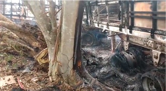 Segundo testemunhas, uma carreta saiu da pista, colidiu em uma árvore às margens da rodovia federal e pegou fogo sendo rapidamente consumida pelas chamas.