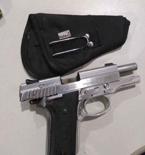 Durante a busca, os policiais encontraram no balcão do estabelecimento uma arma de fogo do tipo pistola calibre 380, municiada com 17 munições, e no interior da residência (que é anexa a lanchonete) mais um carregador com sete munições, uma cartela contendo 10 munições.
