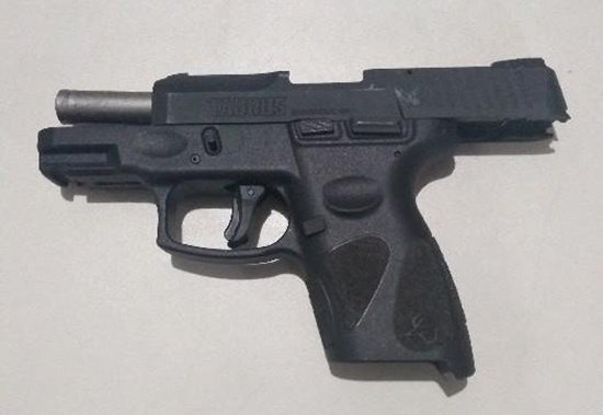 Após o controle da situação foram realizadas revistas pessoais nos quatro suspeitos do crime. Na cintura de um deles foi encontrado um coldre e este alegou que a arma pertencia ao outro abordado. Porém a arma de fogo, pistola G2C calibre .40, utilizada no crime foi encontrada no banco de trás do veículo que dava apoio a ação.