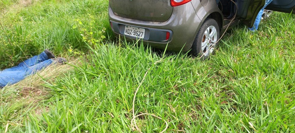 A vítima estava com uma perfuração de arma de fogo no peito e diversas escoriações pelo corpo. Dentro do Fiat palio estava um machado.