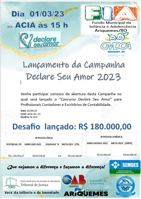 Estamos falando do Fundo da Infância e Adolescência (FIA), um trabalho super importante que tem feito inúmeras atividades em Ariquemes. Na tarde do dia, 27/02, Maria Neuza, Gestora do FIA, e o Professor Ricardo Gentil, Vice Presidente do Conselho Municipal dos Direitos da Criança e do Adolescente, concederam entrevista ao Canal 35.1, onde estenderam o convite do evento Declare seu Amor 2023, que irá ser realizado na Associação Comercial e Industrial de Ariquemes (ACIA), hoje, quarta-feira, 01/03, às 15h. O Conselho Municipal da Criança e do Adolescente apresentará esse projeto, que consiste em angariar fundos para o FIA, trazendo mais benefícios as nossas crianças e instituições de Ariquemes.