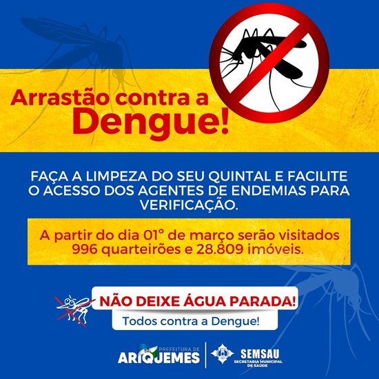 A Secretaria Municipal de Saúde, através do Departamento de Vigilância em Saúde e Atenção Básica, realizam desde o dia 01º de março um arrastão contra a Dengue.