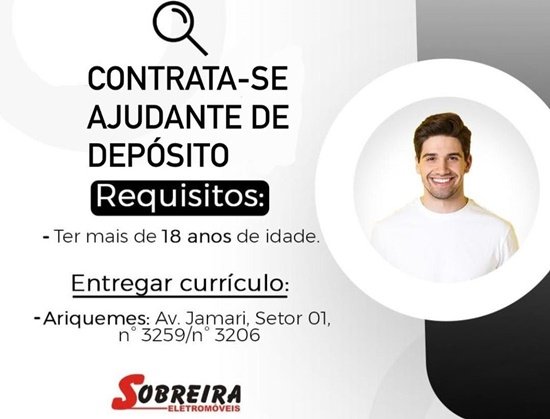 Contrata-se pessoas do sexo masculino, ter mais de 18 anos de idade, para função de Ajudante de Depósito. Os interessados entregar currículo completo com foto na Sobreira Eletromóveis localizada na Avenida Jamari, Setor 01, 3259 / 3206.