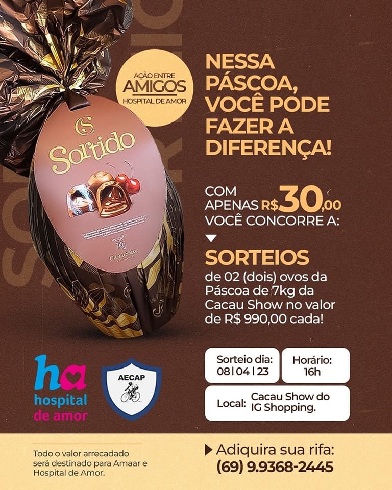 Está chegando o dia do grande sorteio! Você já adquiriu seu cupom e contribuiu com o Hospital do Amor? Então corra, pois o resultado será divulgado no dia 08/04/2023 e você pode ser o ganhador. Serão sorteado dois (ovos) da Páscoa de 7kg da Cacau Show .
