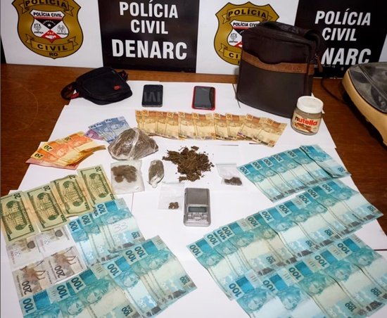Os agentes do Departamento apreenderam diversas porções de droga do tipo skank, balança de precisão com resquício de entorpecentes, R$ 3 mil, $ 80,00 dólares.