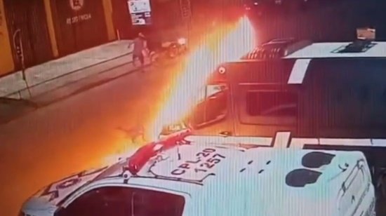 Após a guarnição da PM sair do local, o bandido vai até o baú da motocicleta dele e pega um recipiente com combustível. Na sequência, o criminoso joga líquido inflamável na viatura da Polícia Civil e coloca fogo.
