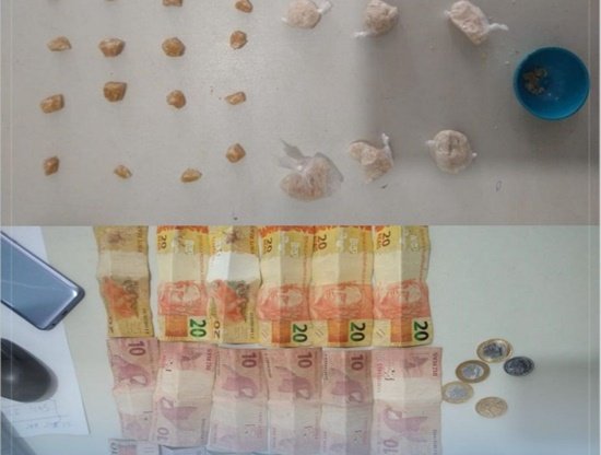 A guarnição em patrulhamento pelo bairro Setor 2, avistou um rapaz que estava quebrando no chão algum tipo de substância, ao percebe a viatura, ele parou e tentou fugir da abordagem policial, porém sem sucesso. Com ele foi localizado uma faca de mesa cabo azul, uma carteira com mais de R$ 200,00 em espécie em notas miúdas, e uma porção análoga a maconha.