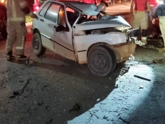 O Uno que seguia sentido oposto, atingiu a lateral esquerda dianteira do caminhão, ficando totalmente destruído.