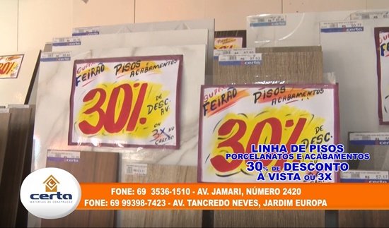 Não perca essa oportunidade! Momento perfeito para você construir ou reformar neste Mega Feirão da Certa Materiais para Construção! Somente até o dia 29/04, o verdadeiro Feirão é aqui na Certa Materiais para Construção Localizada na Avenida Jamari, Centro e na Praça do Lago na Avenida Tancredo Neves. Telefone: 3536-1510.