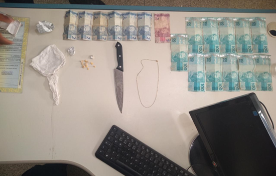 O material tratava-se de uma embalagem que cotinha: 11 pedras de drogas semelhante ao crack, R$ 1.117,00 em espécie, um cordão dourado e uma faca. Diante do flagrante, a mulher foi presa e apresentada à delegacia.