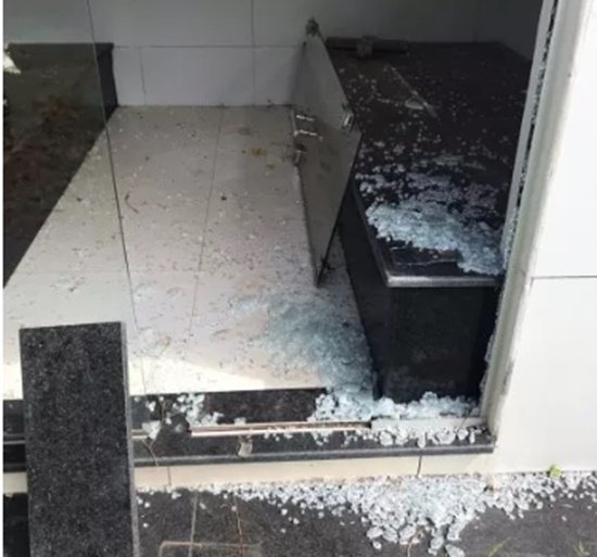 Uma cruz de mármore, arrancada de outro túmulo, foi utilizada para os golpes que deixaram estilhaçada a vidraça frontal da sepultura.