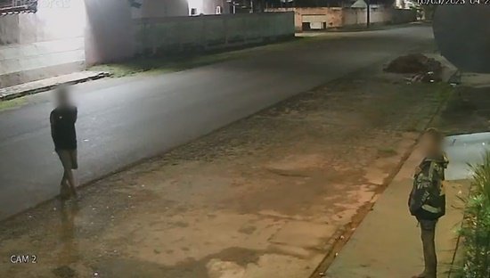 Câmeras de segurança registraram toda a ação dos bandidos. As imagens mostram o casal chegando no local e os dois sentam em frente ao escritório.