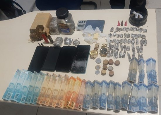 A equipe do Canil do 7º BPM foi acionada, e a cadela farejadora, Bela, localizou dentro de pneus e em um armário, mais 54 porções de drogas semelhante à maconha. Ainda no local, foram localizadas uma balança de precisão, mais de R$ 300,00 em espécie, celulares, munições e objetos de procedência duvidosa.