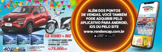 O Rondôncap de domingo dia 18 vai sortear dois veículos de uma só vez e o título só 10 reais! No quarto prêmio tem um Renault Kwid e uma Honda Biz juntinhos no valor total de 75.000 reais!
