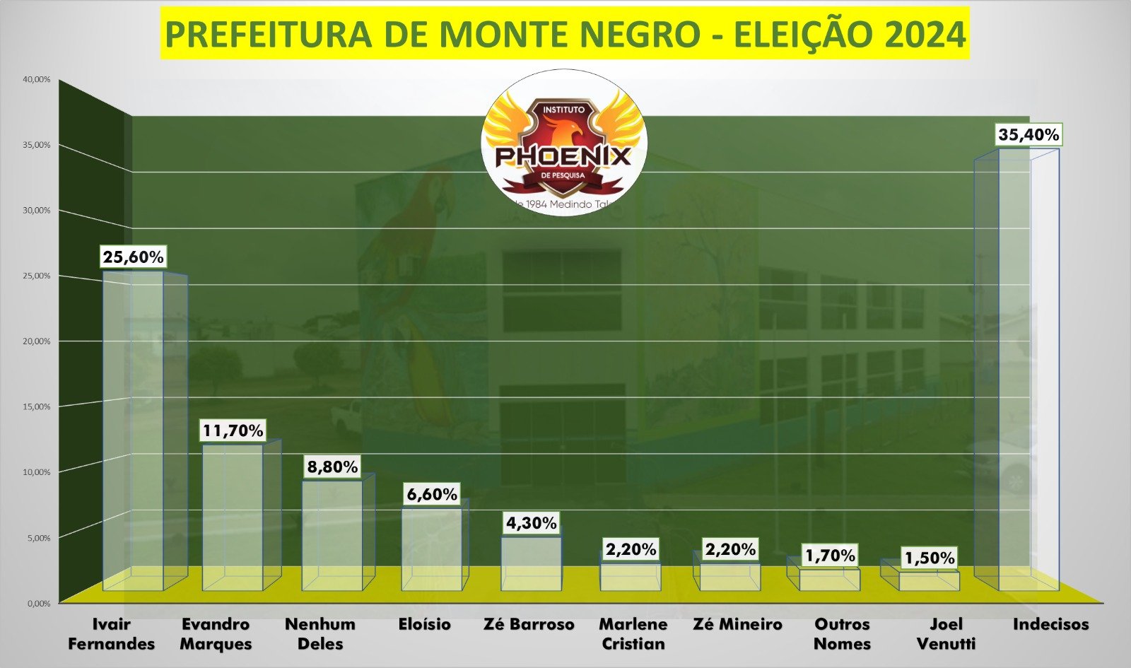 Completam a lista de pré-candidatos, a secretária municipal Marilene Cristian e o pecuarista Zé Mineiro, empatados om 2,2%, e o vereador Joel Venuti (1,50%). Indecisos somam 35,40% dos entrevistados. Não votaria em Nenhum dos candidatos (8,80%) dos entrevistados e 1,70% votariam em outros nomes.