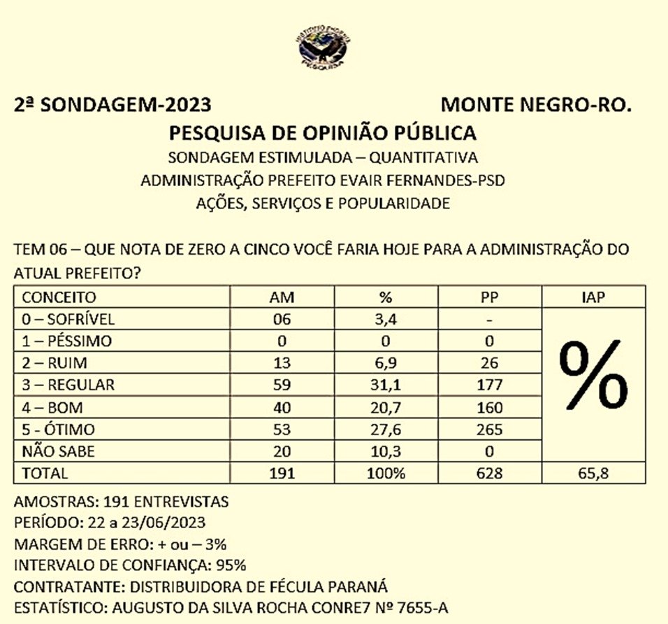 Pesquisa realizada entre os dias 22 a 23 de junho de 2023 com 191 eleitores. Possui margem de erro de + ou -3% e Intervalo de confiança de 95%. Foi contratada pela empresa Distribuidora de Fécula Paraná e assinada pelo estatístico Augusto da Silva Rocha (conre 7655-A).