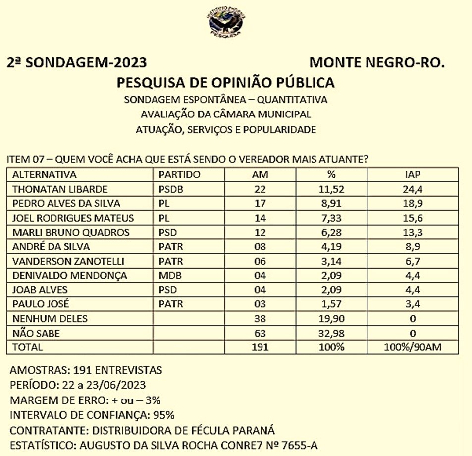 Thonatan Libarde foi o mais bem avaliado com 24,4% de Índice de Aprovação Popular (IAP), seguido de Pedro Alves (18,9%) e Joel Rodrigues (15,6%).