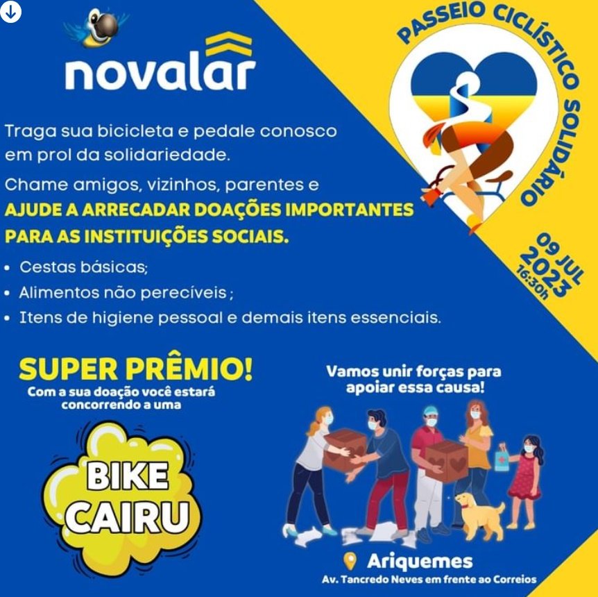 Proprietários e colaboradores do grupo Novalar em Ariquemes convidam a todos para participarem do “Passeio Ciclístico Solidário Novalar”, que irá ocorrer neste domingo, 09/07, com o objetivo de arrecadar alimentos não perecíveis e ajudar famílias carentes.