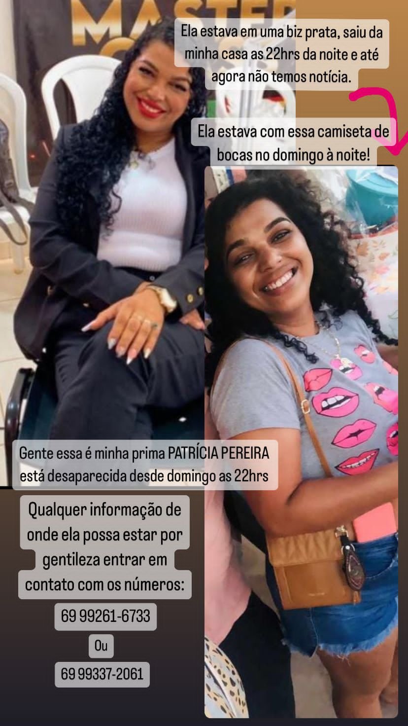 O Boletim de Ocorrência foi registrado no início da tarde desta terça-feira, dia 18/07, informando o desaparecimento de Patrícia Pereira do Nascimento, 34 anos. Segundo o Boletim, Patrícia foi vista pela última vez no domingo, dia 16/07, por volta das 22 horas. Ela teria ido até a casa de sua prima e também babá da sua filha de 5 anos, algo que é de costume de Patrícia, deixado sua filha e saído em uma motoneta Biz de cor prata. Segundo a Prima de Patrícia que procurou a TV do Povo - Canal 35, ela informou para nossa reportagem que adentrou a casa da Patrícia, localizada no Setor 05, e encontrou na sua cama a bolsa com seus documentos e seu aparelho celular (único meio de comunicação de Patrícia). A mulher foi informada pelo vizinho que viu Patrícia saindo de sua casa na segunda-feira, dia 17/07, por volta das 04 horas da manhã. A família de Patrícia, que não mora em Ariquemes, está desesperada e pede que se alguém tiver qualquer informação, entre em contato com o número funcional da Polícia Militar (190). Além da filha de 5 anos que está com a Prima, Patrícia também tem um filho de 10 anos, que até o momento esta com sua vizinha.