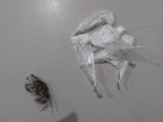 A guarnição em patrulhamento pelo bairro Setor 02, quando visualizou um homem em atitudes suspeitas em frente a um comércio e o abordou. Ao realizar a abordagem no indivíduo foi encontrada uma porção de entorpecente análoga a maconha, seis invólucros de entorpecente análoga a cocaína, uma corrente e um aparelho celular. O suspeito já tinha uma passagem por tráfico de drogas em seu desfavor. Perante a situação o indivíduo foi conduzido a Unisp, juntamente com os objetos e as drogas apreendidas para as medidas necessárias.