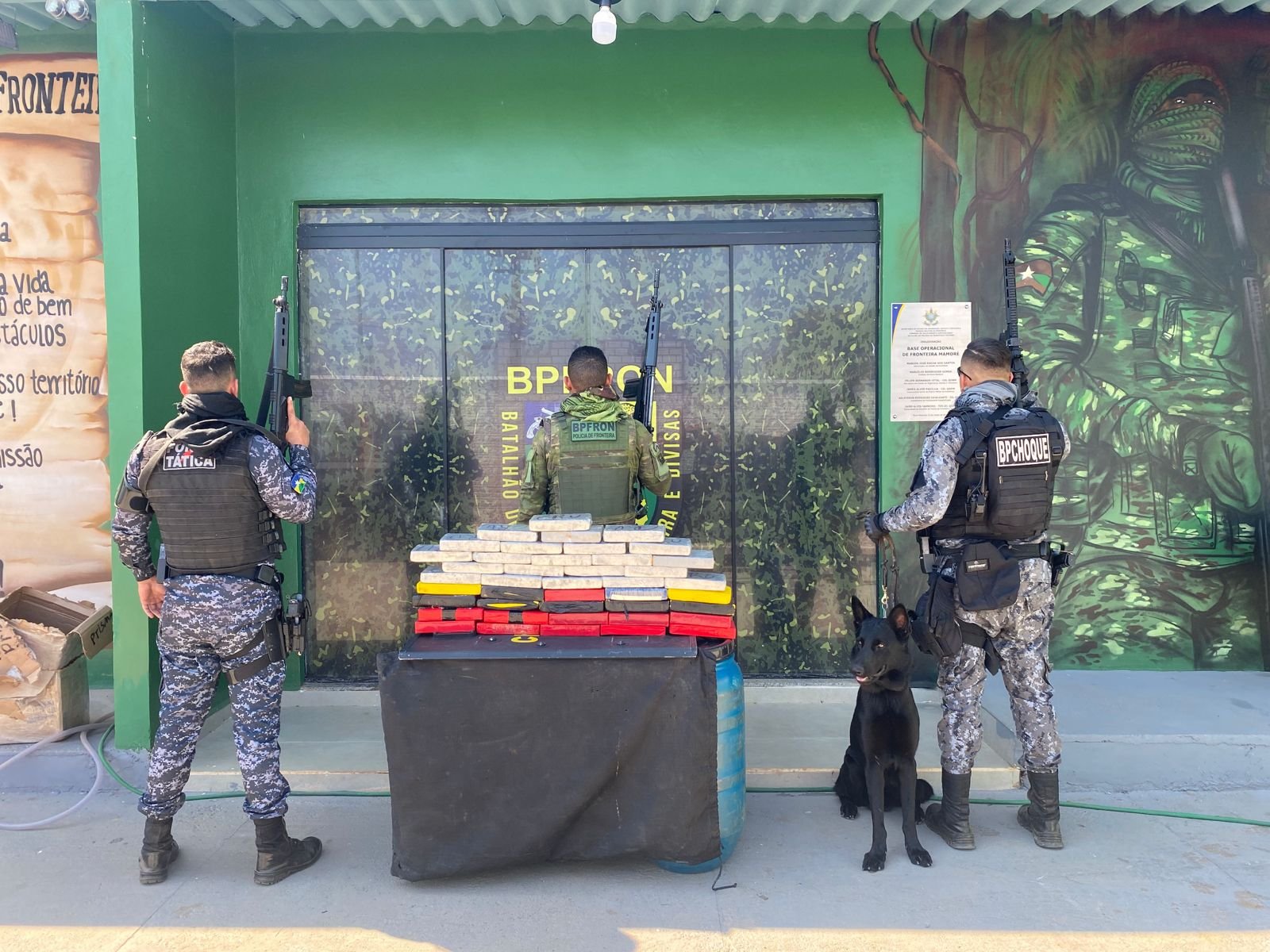 Durante OPERAÇÃO HÓRUS/GUARDIÕES DAS FRONTEIRAS, em combate aos crimes transfronteiriços, as forças de segurança pública composta pelo Batalhão de Polícia de Fronteira e Divisas - BPFRON, Batalhão de Choque /Canil, Força Tática 5° BPM e CRP-I, realizaram a apreensão de (45) quarenta e cinco quilos de sustância entorpecente.